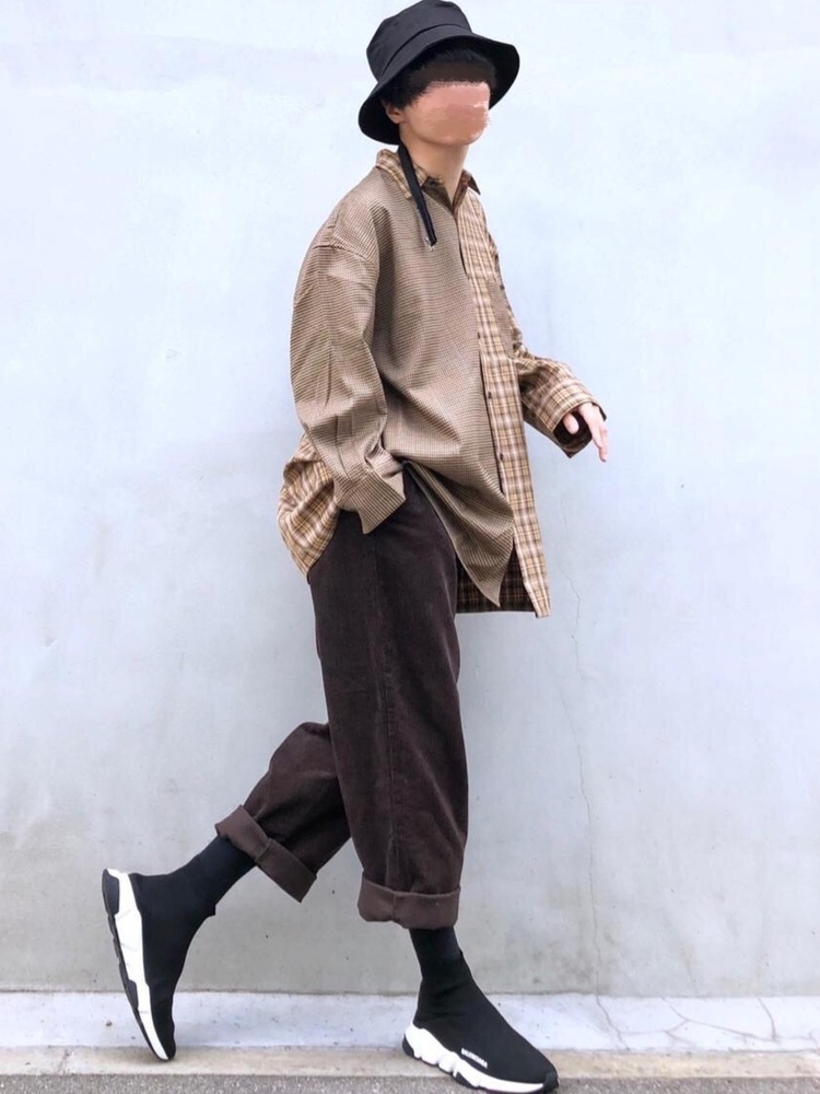 チェック柄が入ったデザイン性の高いオーバーサイズシャツを合わせた、秋のメンズコーデです。トップスの明るいベージュから引き締め効果のある濃いブラウンのボトムス、そして足元にかけてコーデでグラデーションを作っていることがポイント。今人気の高いバケットハットを被り、着こなしにトレンド感も持たせています。