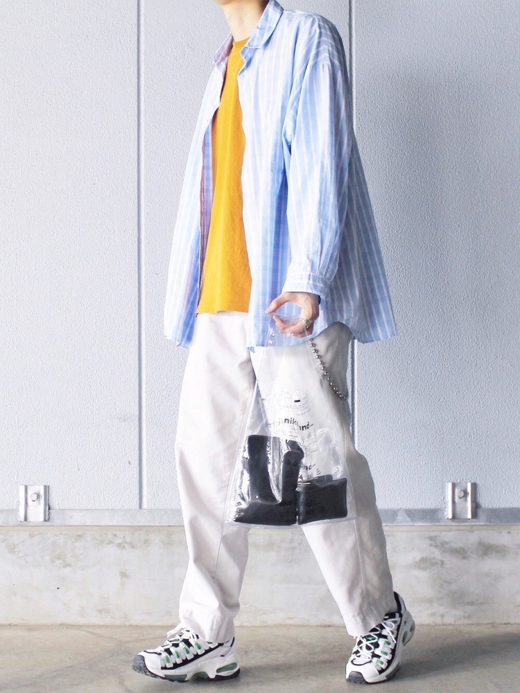 ブルーのストライプ柄オーバーサイズシャツのインナーに、鮮やかなイエローTシャツをインナーに合わせれば、爽やかな夏のメンズコーデに。腰あたりの丈のシャツなら、スキニータイプのパンツ以外でもバランスよく着こなせます。ブルーとイエローを引き立てるように、パンツとスニーカーは白で統一し、清涼感のある組み合わせになっていることもおしゃれです。