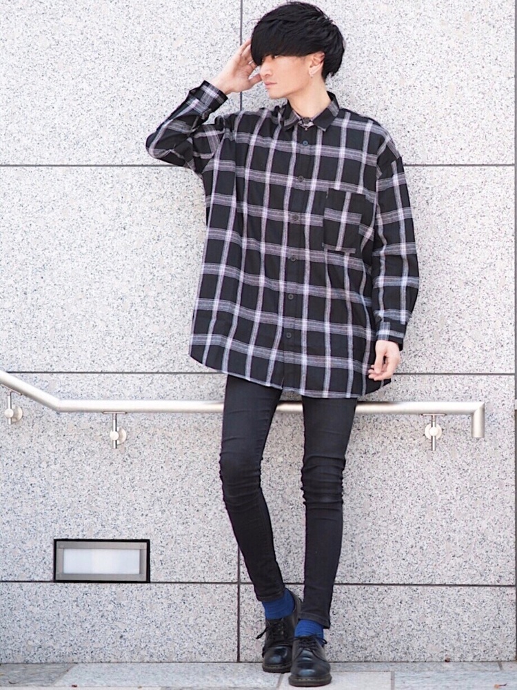 チェック柄のロング丈オーバーサイズシャツは、ダークカラーを選べばカジュアルな中にも品のあるメンズコーデに仕上がります。スキニーパンツをボトムスにチョイスし、上半身とのバランスを取ることで全身の細見え効果もアップ。チラ見せさせたロイヤルブルーのソックスが、コーデのさり気ないメリハリになっています。
