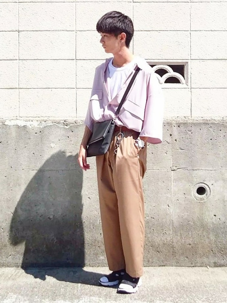 ピンクとベージュのソフトな色合いの組み合わせがおしゃれな、カジュアルメンズコーデです。ボックスシルエットかつ袖丈が長いオーバーサイズシャツは、ボタンを開け少しルーズに着こなすことで、インナーとの重ね着でも暑苦しく見えない旬な着こなしに。