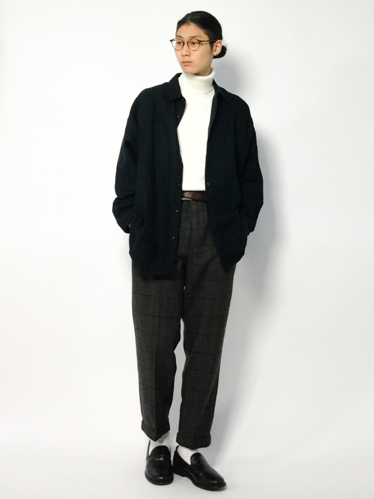 ロング丈のオーバーサイズシャツをアウターにしたメンズコーデです。インナーの白のタートルネックはタックインして、ベルトで引き締めることでモノクロコーデに品の良さをプラス。チェック柄のウールパンツと小物の丸メガネを組み合わせれば、ほんのりブリティッシュな雰囲気がおしゃれな着こなしにまとまります。