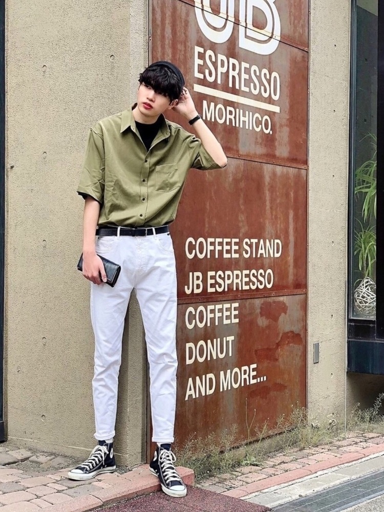 カーキのオーバーサイズシャツと白パンツを合わせた、爽やかなメンズコーデです。シャツはタックインし白パンツの割合をコーデの中でも多くすることで、女子ウケもいい清潔感のある印象が生まれます。チラ見せした黒のインナーとスニーカー、ベルトでキリッと男らしい雰囲気を足している工夫がおしゃれ。