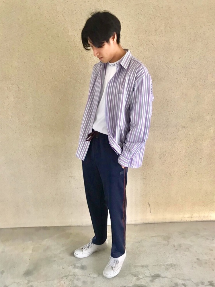 シャツはワイドパンツにタックインして、コンパクトに着ることで綺麗めな印象も保持。黒のバッグとスニーカーが、コーデを引き締めています。