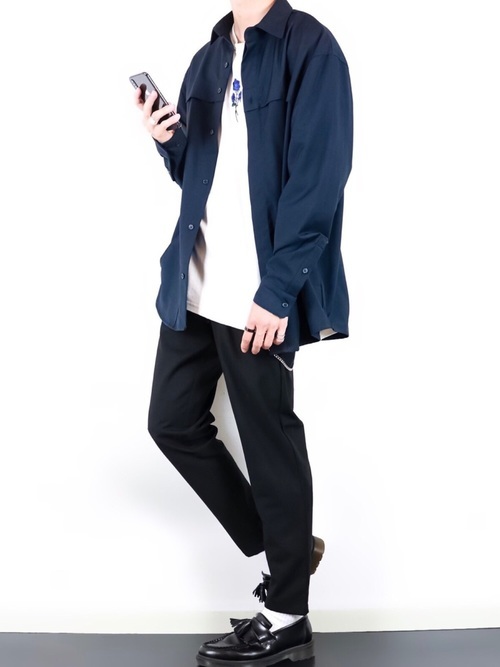 ネイビーシャツ×テーパードパンツ(黒)