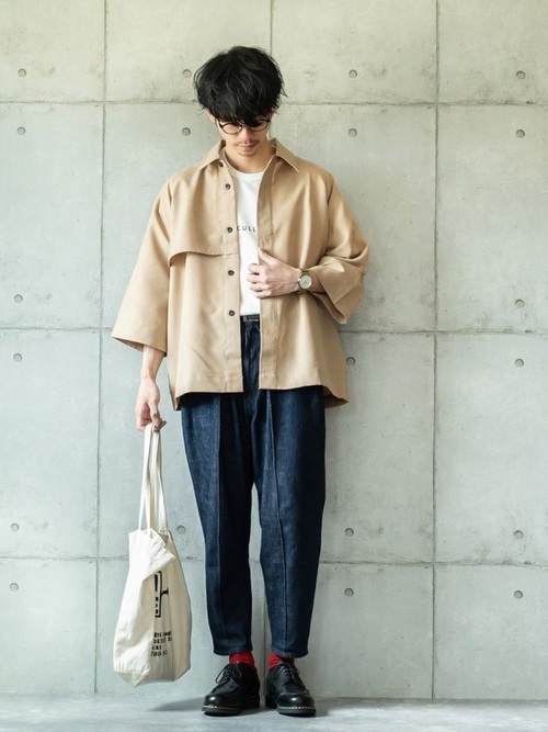 トレンチコートのようなAラインのシルエットが斬新なジャケットに、ブルー系のデニム素材のテーパードパンツを合わせたメンズコーデ。ゆったりとしたアウターだからこそ、シャツはタックインが今っぽいスタイルです。丈を上手に意識して、少し覗かせた赤のソックスがアクセントになって、全体をおしゃれな印象にしています。
