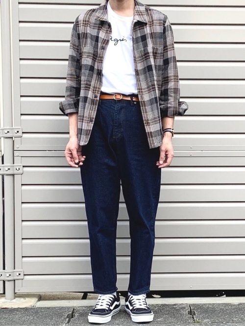 チェックシャツ×テーパードパンツ(デニム)