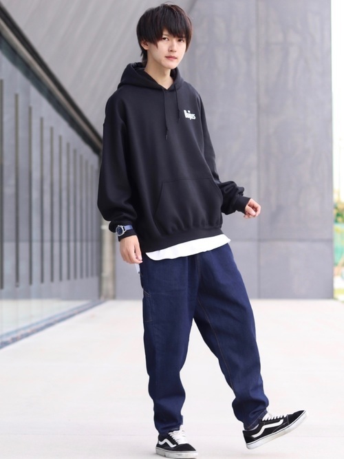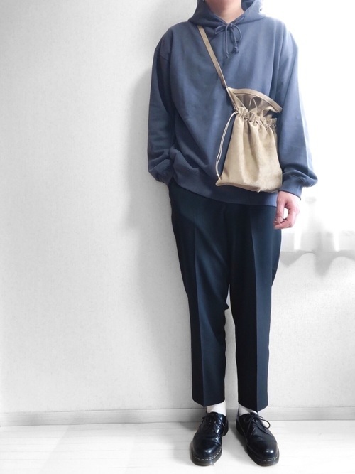 カジュアルなパーカーも黒のテーパードパンツを合わせれば、普段着っぽくならずきちんときこなせます。トップスにボリュームがあるスタイルですが、スキニーのような細めのテーパードパンツのおかげですっきりとまとまります。