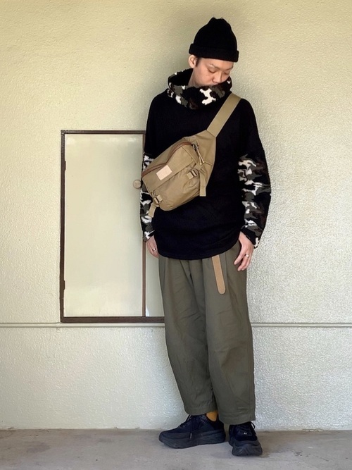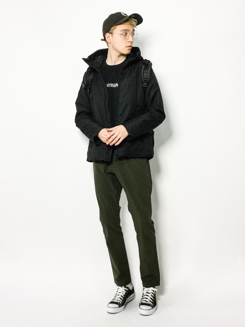 黒のシャツとブルゾンに細めのスリムタイプのテーパードパンツのコーデです。アウトドアを思わせるグラミチ のテーパードパンツが、と全体をスポーティーな印象にしています。丈がちょうどよく、スニーカーの存在感も引き立てています。