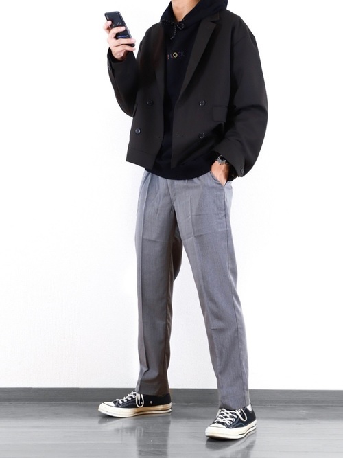 黒ジャケット×テーパードパンツ(グレー)