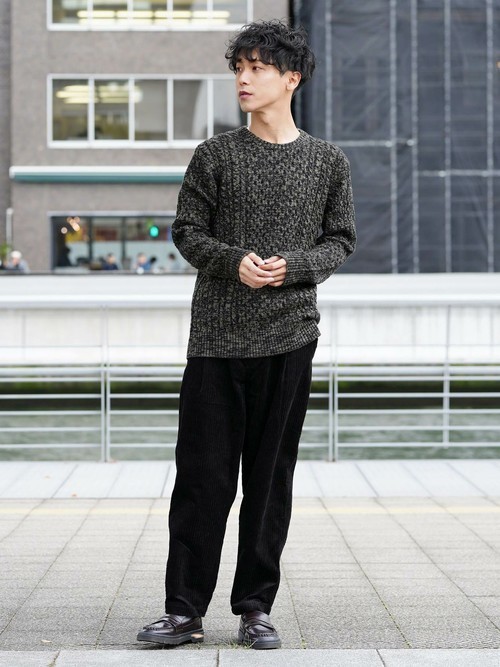 コーデュロイの太めのテーパードパンツに、シンプルなニットを合わせたスタイルです。パンツが十分個性的なので、トップスのデザインはシンプルでもおしゃれに仕上がります。色をモノトーンにすれば大人っぽさが増します。