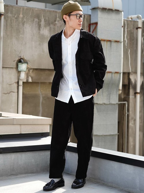 トップスもボトムスも黒でまとめ、ピンク系のコーデュロイのシャツを差し色にした上級者っぽいおしゃれスタイル。ワイドなスラックスタイプのテーパードパンツに大きめのTシャツを前だけタックインして、着こなし感を出しています。ラフさもきっちり感も両方持ち合わせたテーパードパンツは絶妙な丈で、よりおしゃれに仕上がっています。