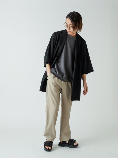 ジャケットとの相性が良いのもテーパードパンツの魅力。楽に着れるのにスタイル良く見えて、アウターがジャケットならオフィスカジュアルにもなります。