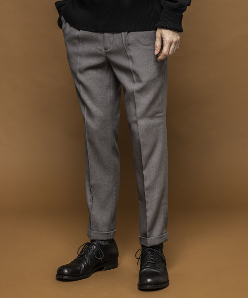 ブラウン、ネイビーと並んで活躍するグレーのテーパードーパンツ。スリムなスラックスタイプならオンでもオフでも着こなせます。生地に厚みがあり、ワンタックでセンタープレスなので、すっきりとしたシルエットでスタイル良く見せてくれます。足元はダブルの裾でビジネスにもぴったりです。