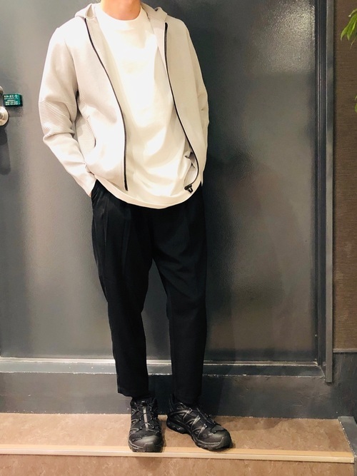 季節の変わり目に活躍するニットパーカー。薄いグレーと白のトップスも黒のテーパードパンツなら全体が締まります。パンツは着心地がよいツータックで、ひざ下からテーパードさせたシルエットのイージーパンツ。秋にヘビロテ間違いなしのアイテムです。