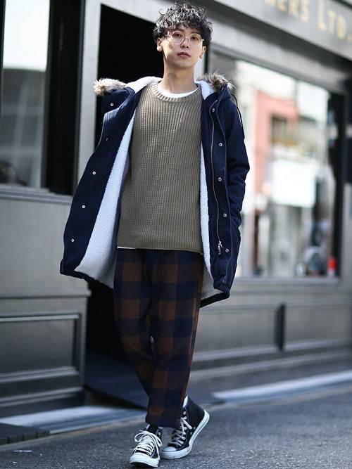 秋はコートを楽しめる季節でもあります。個性的なチェックのテーパードパンツに黒のニットの組み合わせで、直線的なコートを羽織っても柔らかい印象です。全体のバランスを考えると、スキニーほど細くないスリムタイプのパンツがおすすめです。