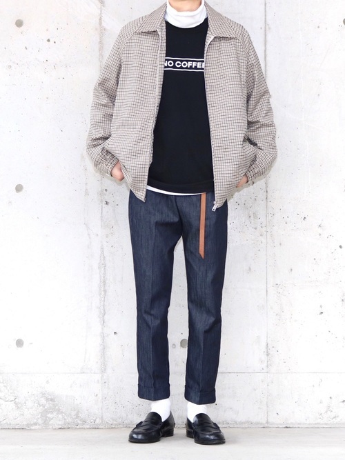 デニム素材のテーパードパンツに、カットソー・タートルネックT、ジップブルゾンのメンズコーデです。パンツは細めで丈が短めなので、3枚重ねたトップスのボリュームも気にならずバランスの取れた着こなし担っています。