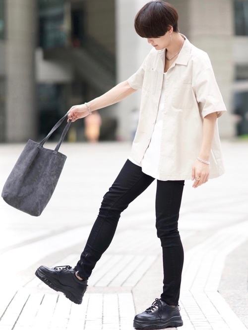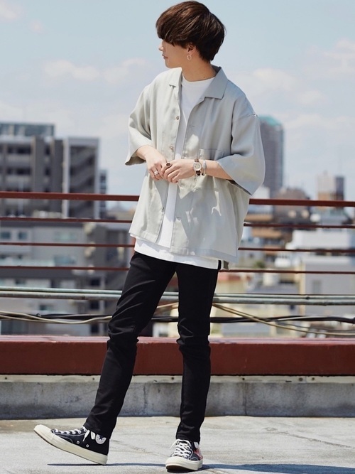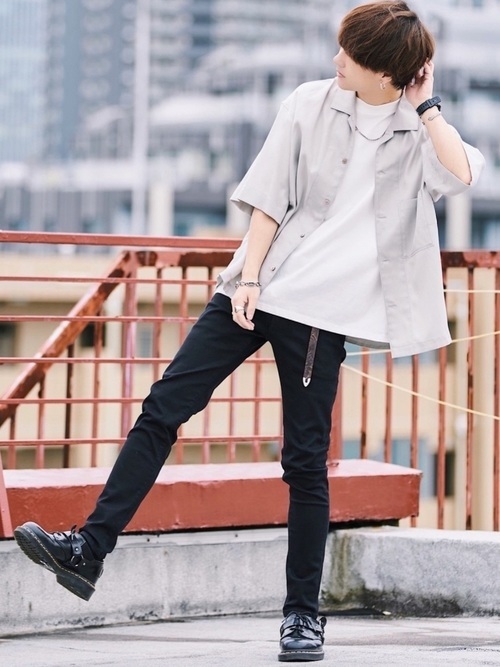 スキニーパンツ×オープンカラーシャツ