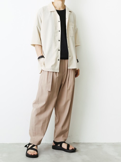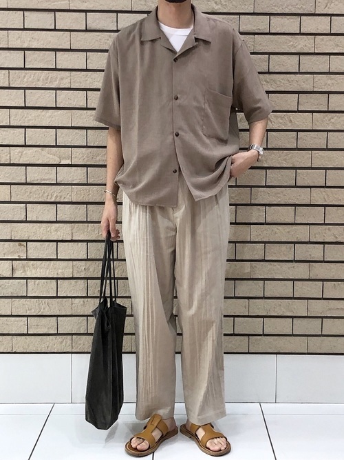 濃淡のコントラストで楽しむベージュのワントーンコーデです。半袖オープンカラーシャツは、ドレスシャツにも使用されるポプリン生地を使用。ワッシャーパンツはリネン素材で作られていて、さらっと夏らしい着こなしに上品な印象を与えてくれます。