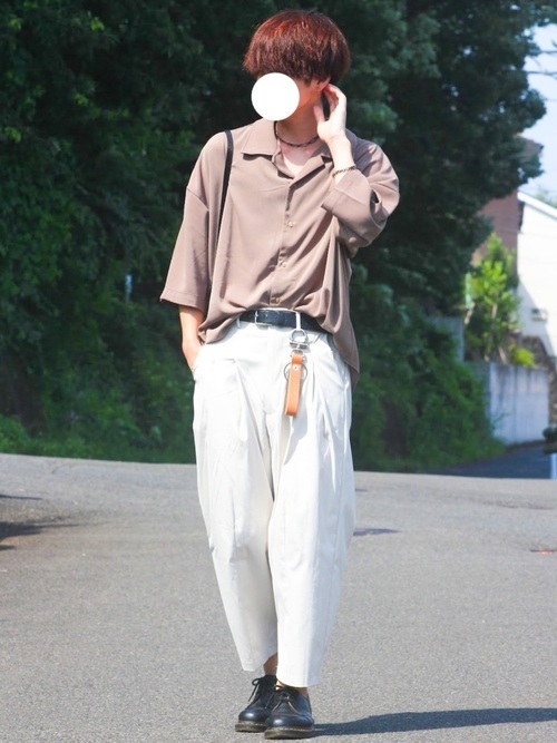 ベージュ系の半袖オープンカラーシャツに白のアンクルパンツを合わせた、夏におすすめの爽やかな着こなし。上品なメンズコーデにまとめつつ、ネックレスやキーアクセサリーなどの小物でおしゃれをプラスしています。