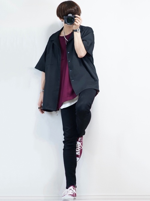 黒の半袖オープンカラーシャツにスキニーパンツ、パープル系のTシャツにスニーカーを合わせた、シックなカラーの夏コーデです。半袖オープンカラーシャツはゆったりとしたデザインながらも、スキニーパンツを合わせることで、スマートな着こなしとなっています。白のインナーが程よく見えているのが、おしゃれのアクセントです。