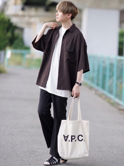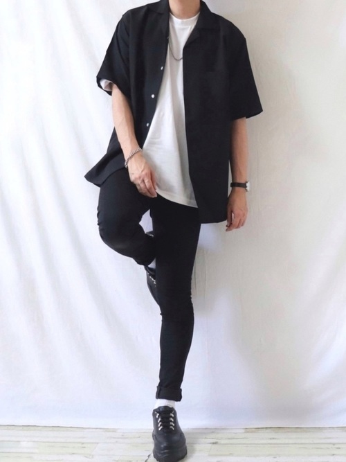 黒の半袖オープンカラーシャツにパンツ、白のインナーを合わせたモノトーンコーデです。通気性と速乾性に優れた半袖オープンカラーシャツのため、夏に心地良く、さらっと羽織る着こなしにマッチします。