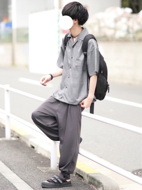 グレーの半袖オープンカラーシャツにグレーのイージーパンツを合わせた、夏のワントーンコーデです。半袖オープンカラーシャツはとろみ感のある素材で作られていて、艶っぽい質感と着心地の良さがあります。