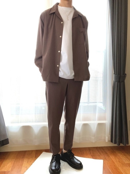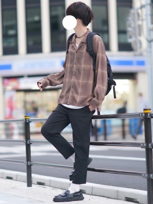 長袖オープンカラーシャツに秋色のブラウンカラーをセレクトすることで、季節感のある着こなしに仕上げています。スラックスとローファーを合わせて、キレイめなメンズコーデです。