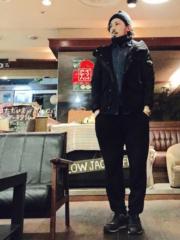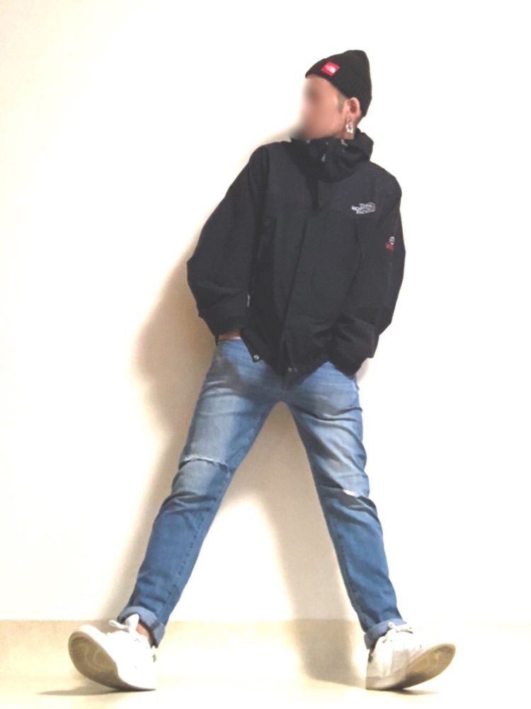 マウンテンパーカーにニット帽、デニムパンツというシンプルなコーディネートです。マウンテンパーカー自体アクセントが強めのアイテムなので、これくらいシンプルでもかっこよく着こなすことができます。色合いが多すぎるとぐちゃぐちゃした印象になるので、使う色は控えめにすることが好ましいです。