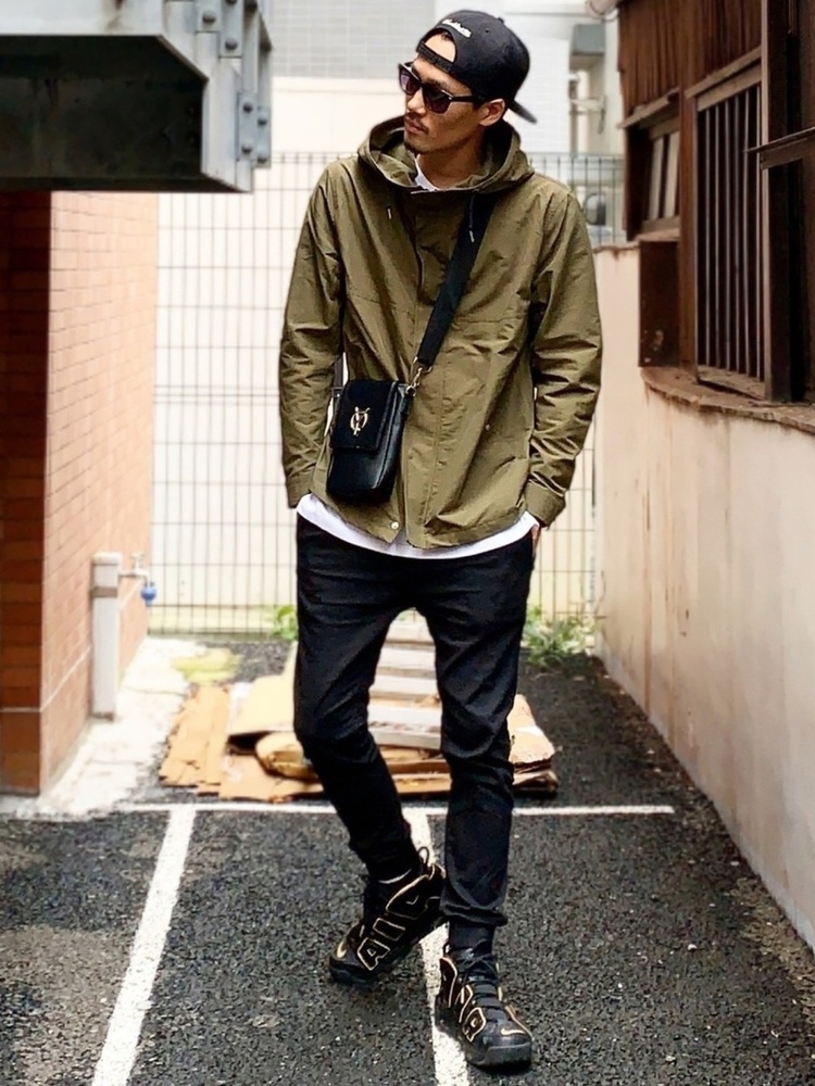 このコーディネートのポイントは、シンプルな黒パンツに薄めのマウンテンパーカーを組み合わせることでボリュームを抑えているところです。こうすることで全体的にすっきりとした印象を持たせることができます。野暮ったいイメージになりがちなマウンテンパーカーを上手に着こなしている良い例ですね。
