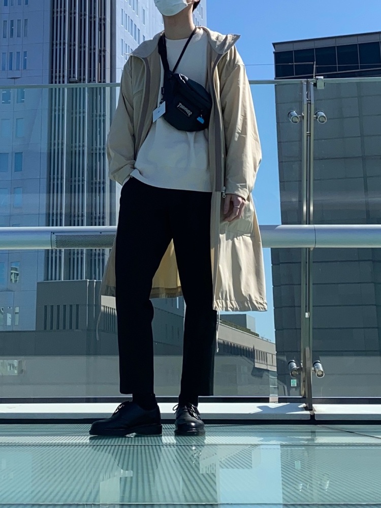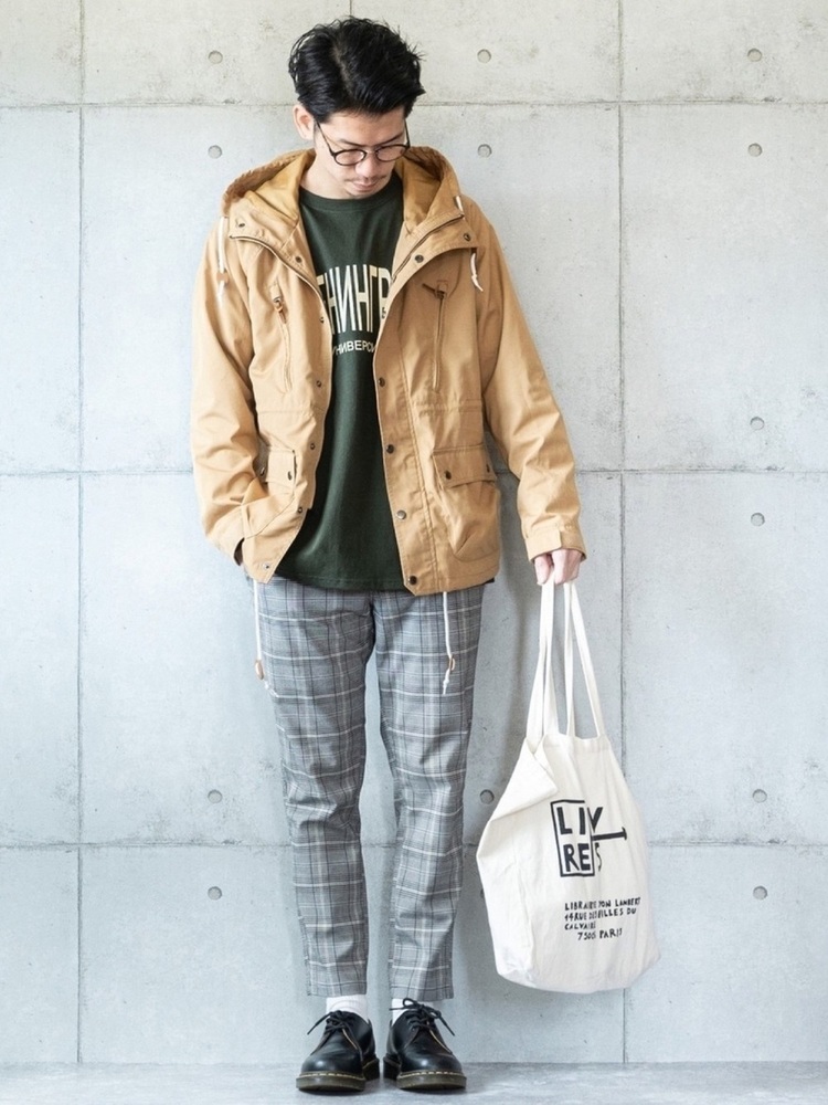 ロング丈のマウンテンパーカーを着用するのもおしゃれポイントの一つです。その場合、インナーは短めのもの、パンツは細めのシルエットのものをおすすめします。あえてアウターを長くすることでこなれ感を演出し、全体的なバランスをとっているところがポイント。程よいラフ感を目指したい方に真似して欲しいコーディネートです。