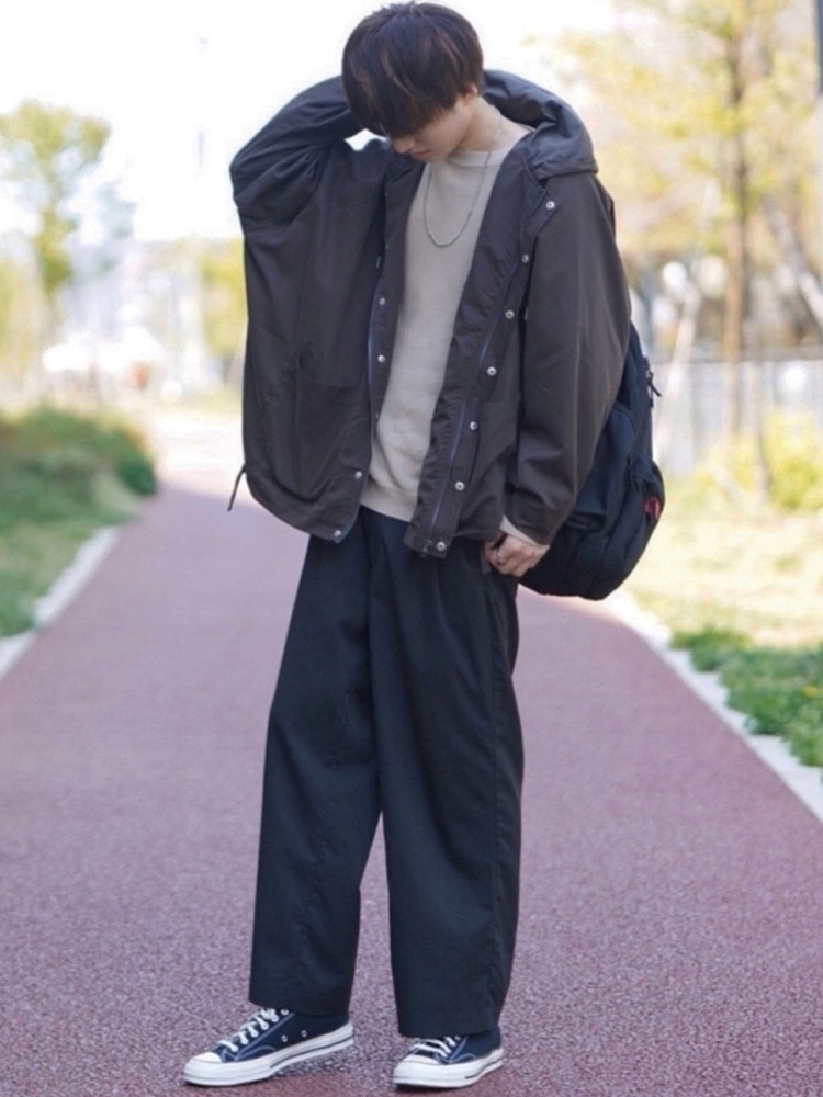 少し難しめのおしゃれにチャレンジしたい方は、このようにボリューム感の少ないマウンテンパーカーに、ゆるっとしたシルエットのパンツを合わせてみるのもおすすめです。シルエットが特徴的なぶん、シンプルに仕上げることが大事なポイントになります。カジュアルかつふんわりした雰囲気を演出できますよ。