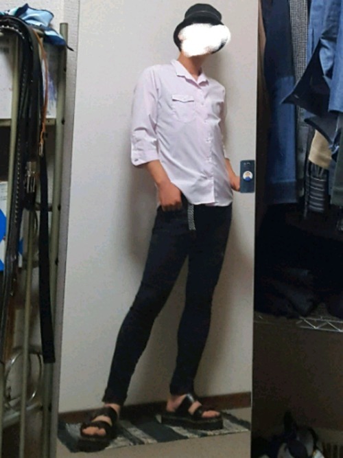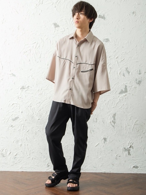 襟の形に注目したコーデ例の2つめがこちらです。しっかりとした襟が特徴の七分袖シャツを使っています。普通のスキッパーカラーのシャツですが、羽織りとして使えばショールカラーのような印象も出せます。インナーTシャツからボトムスまで一体のブラックコーデをしっかりとまとめる、秀逸な七分袖シャツの使用例です。