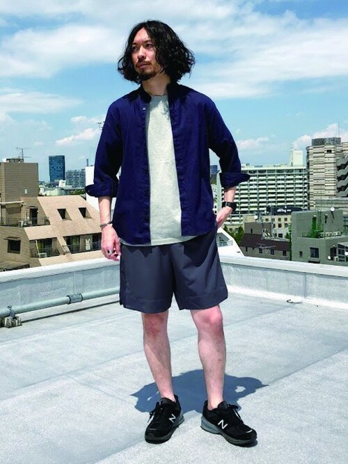 素材に注目したコーデ例の2つめは、ナチュラルな素材のシャツを重ね着してインナーのグレーとネイビーのみでまとめた夏らしい着こなしです。トップスとパンツで異素材を合わせた、基本的に手を出さない方が良い上級者向けのメンズコーデですが、こちらは服の丈や重ね着のカラーをうまく調節して全身でまとまるようにコーデされています。