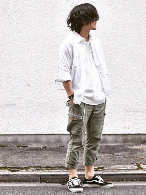 こちらは七分袖シャツを羽織ることで、丁度よいラフさを出しています。ポイントは、アンクル丈のカーゴパンツで全体的に緩めシルエットを作っているところです。緩めインナーの上に七分袖シャツを羽織っているため、上半身のシルエットがゆったりとしています。それに合わせてボトムスも同じくゆったり目をセレクトしています。