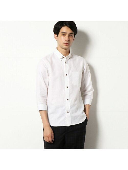 ボタンダウンシャツでトラディショナルな印象の七分袖シャツです。ヨークやカフスの内側に別布を使っているので、ちらりと見えた時のおしゃれを楽しむことができます。また、生地は上質なコットンとリネンなので、光が当たると上品な陰影を楽しめます。