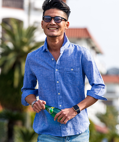 カラーバリエーションが豊富な七分袖シャツもおすすめです。こちらはコットンリネンのシャツ。さらりとした雰囲気が特徴的です。ハーフパンツと合わせてカジュアルにコーデしたり、シンプルな黒パンツやデニムと合わせて爽やかにコーデしたりと着こなしの幅が広がります。インナーのカラーに合わせて何着か持っておいても良いでしょう。