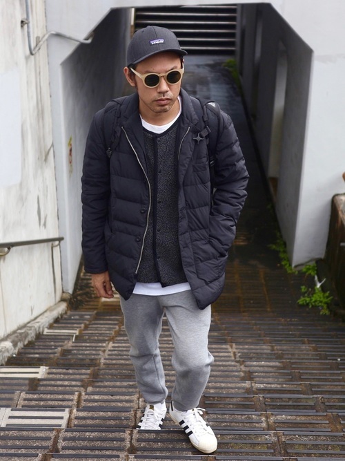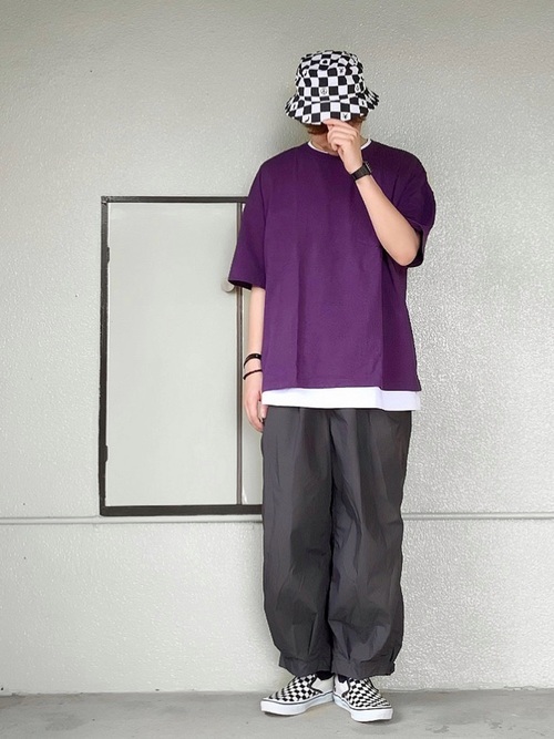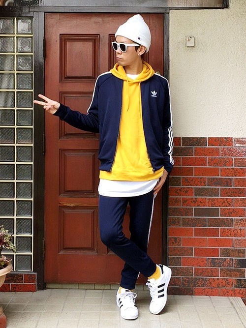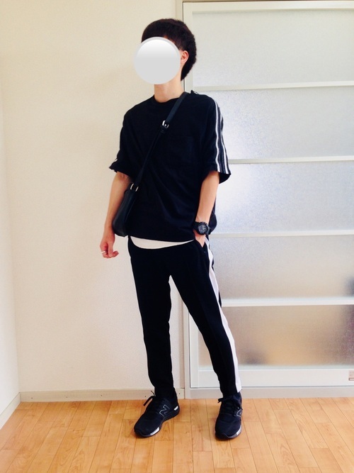 デザイン性のあるスウェットトップスと、スポーティテイストなパンツでスポーティmixコーデに仕上げているこちらのコーデ。スウェットのインナーにロング丈Tシャツを着こなし、レイヤードスタイルを作ることで、全体的にスリムな印象を与えています。