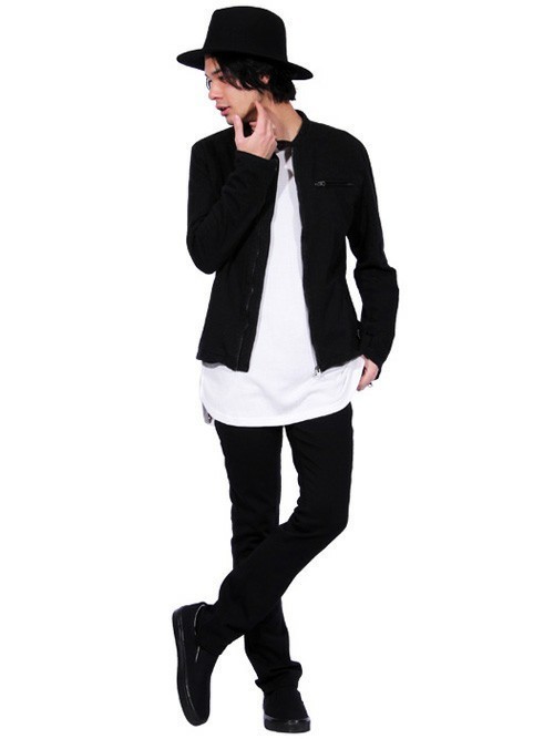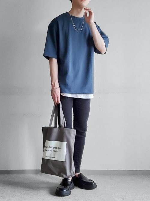 ロング丈Tシャツにオールブラックコーデは定番ではあるものの、スキニーパンツのデザイン性で他との差を付けられます。