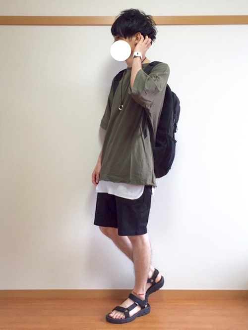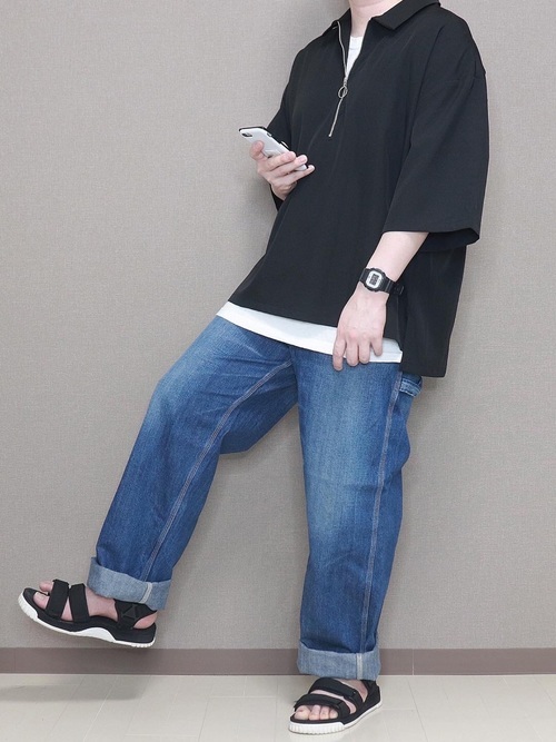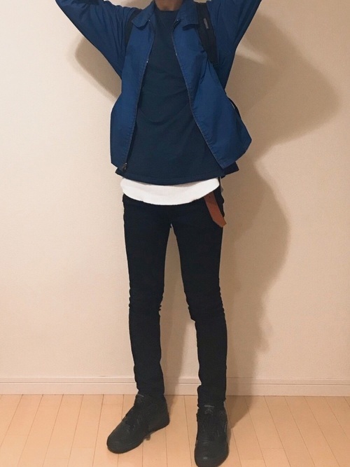 コーデのアクセントとしてほんの少し見えるロング丈Tシャツを合わせると、よりおしゃれなコーデに変身。ロング丈Tシャツはオールブラックコーデにベストマッチするので、積極的に試してみましょう。