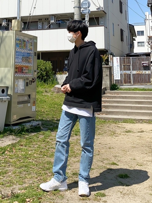 こちらも寒い時期の定番アイテムであるフード付きパーカー。若い男性から大人男性までカジュアルな着こなし方ができる万能アイテムです。ここにもインナーにロング丈Tシャツを取り入れてみましょう。上半身のダボッと感が白色を挟むことで締まり、スタイルアップに。また長袖や厚手のロング丈Tシャツを着れば防寒対策にも繋がります。