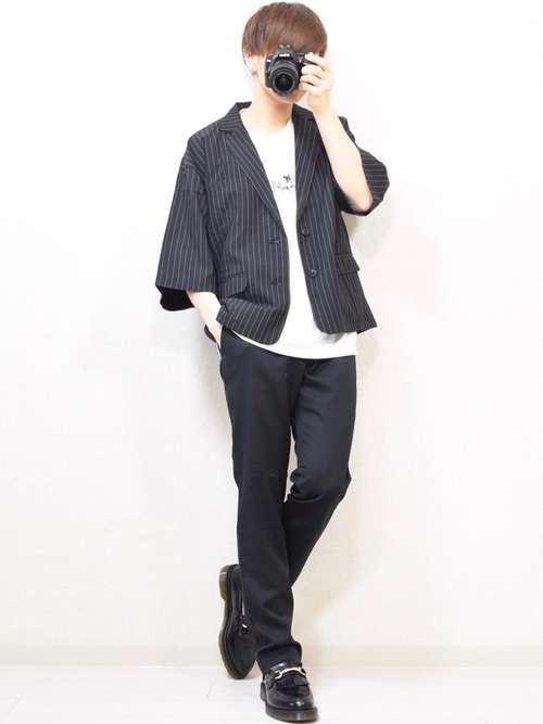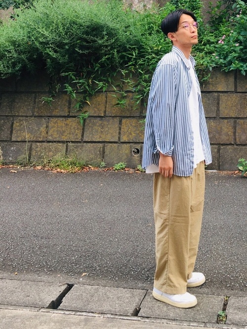 ストライプ柄はシャープで男性らしい印象を与えますが、コーデの組み合わせ方を悩む方も多い柄です。このような柄物アイテムの時に、白のロング丈Tシャツをインナーに持ってくることでカラーが切り替わり、パンツをあわせやすくなります。