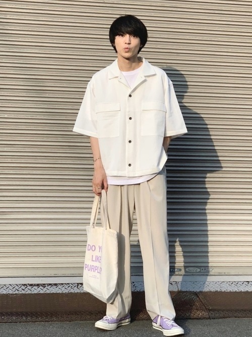 春や夏らしさを感じられ、コーデに上品さをプラスできるオープンカラーシャツ。白のロング丈Tシャツは清潔感を感じるので、シャツと馴染みやすく着こなしやすいです。シャツの袖の長さによって、ロング丈Tシャツも半袖と長袖で調整するようにしてください。
