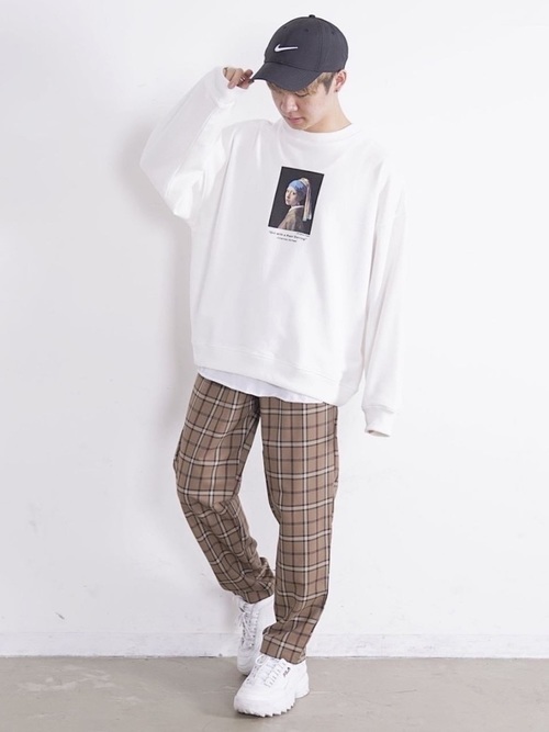 プチプラブランドでも多く扱っているスウェットトップスに、チェックパンツを合わせれば甘めなアメカジスタイルに仕上がります。両アイテムともラフ感を感じさせるので、ロング丈Tシャツのをインナーに重ね着し、レイヤードスタイルを作れば締まりのあるコーデに変身します。