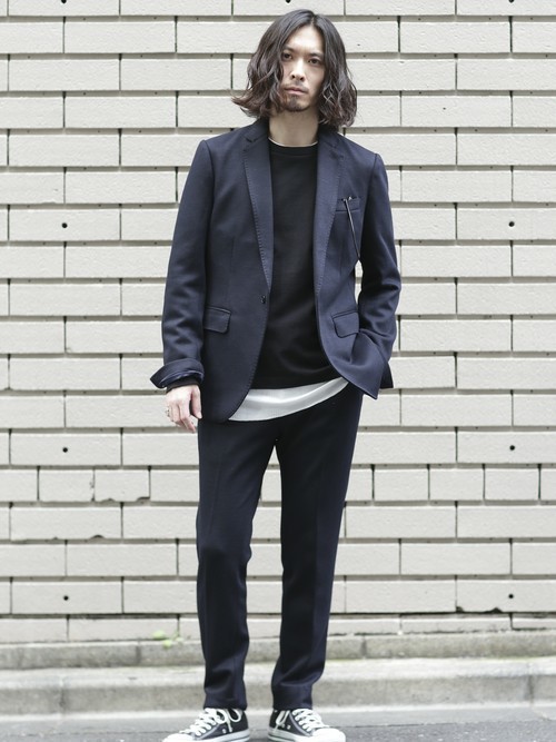 ロング丈Tシャツはジャケットコーデにもマッチします。ダークトーンでまとめたコーデに、元からレイヤードスタイルになっているTシャツを着れば、一気に清潔感と明るみがプラスされたコーデに変身。暑がりの方などはトップスにロング丈Tシャツを重ね着するのではなく、画像のような丈部分が元からついているアイテムを買うといいでしょう。
