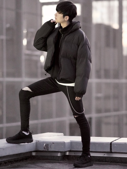 ダウンジャケット×ダメージスキニーパンツコーデ