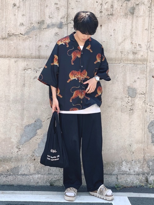 オープンカラーシャツ×ロング丈Tシャツコーデ
