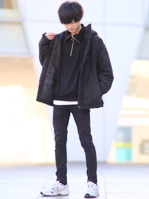 厚手のダウンジャケットは太って見えがち。インナーに着るトップスがスウェットやパーカーであればなおさらです。でもスキニーパンツを合わせることで、スリムな印象を与えます。さらロング丈Tシャツを重ね着すれば、ウエスト部分が明確になりスタイル効果をより発揮。