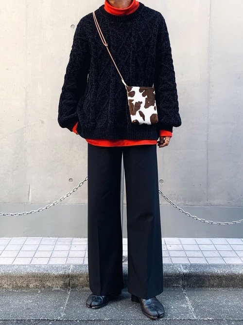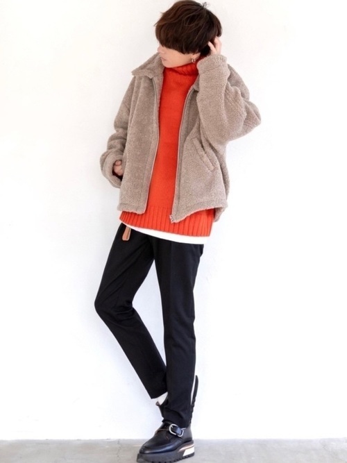 ロング丈Tシャツは白色が定番ですが、カラーアイテムもおすすめです。ダークトーンカラーコーデに差し色としてオレンジ色のタートルネックタイプのロング丈Tシャツを重ね着することで、一気に華やかなコーデに変身。