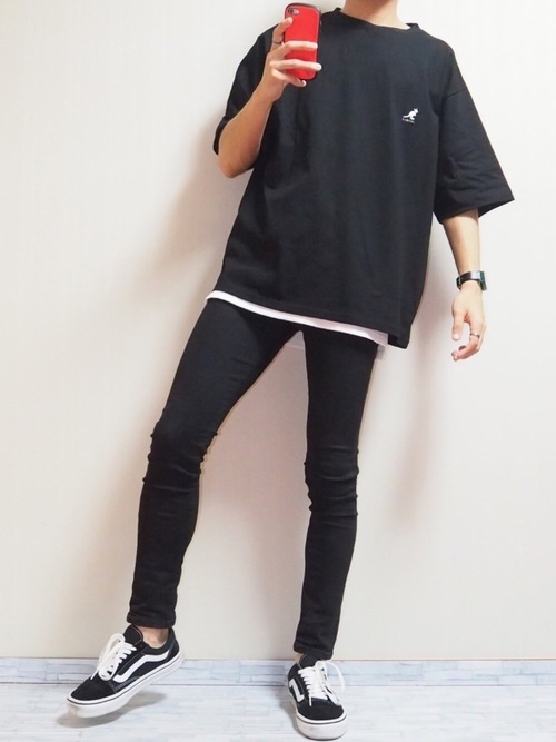 黒スキニーパンツ×ロング丈Tシャツコーデ