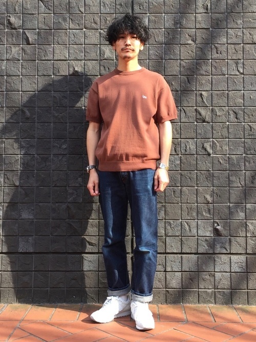 Leeのロゴ入りニットでカジュアルに決めたコーデです。コットンニットだとTシャツであっても優しい雰囲気が出るので、普段「Tシャツ×デニムのシンプルコーデは苦手…」という人でも挑戦しやすいですよ。